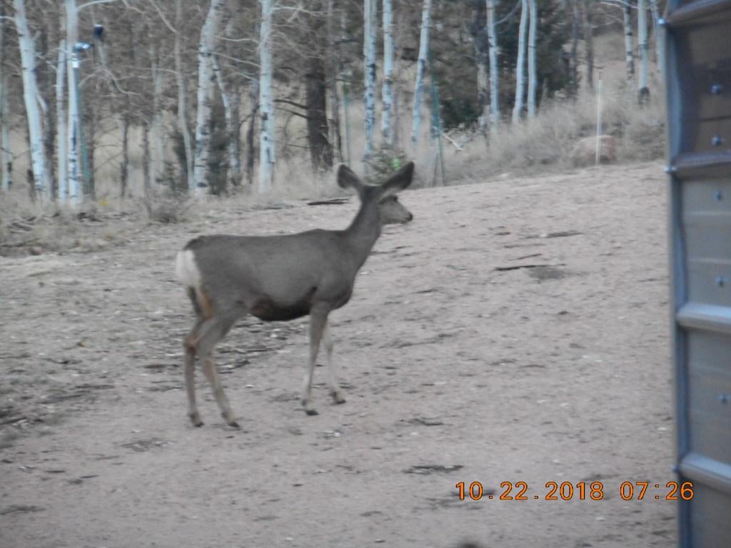 The other early evening as the sun had just set. Outlines were still just visible to the attuned eye I was made aware by our trusty driveway doorbell that we had some sort of visitor at the far end of our wooded 7 acre property. I always love a glimpse of the neighborhood bear or the herd of nearby deer so I grabbed my sheltering warm coat by the door and rushed out to see what was a wondering outside. I also grabbed my long, trusty walking stick in case it was the not so friendly mountain lion looming out in shaded early evening light. As if my walking stick would be a terrific deterrent. I got a bit out there and wow, there she was right there in my face, a doe. It was darker than I had anticipated so we got a bit closer than I had expected. So glad she was a deer. I apologized for any fear I caused her and then noticed she was not alone, there were several others behind her. I let them know the bird bath was full and they could help themselves to it and I turned to walk towards the house and my husband was there wondering what fool thing I was up to out there in the dark woods and I motioned for him to be quiet so as not to frighten them away. He asked, “What are you doing now?” I found that a funny question? He motioned for me to look backwards so I did so and to my astonishment the deer had followed right behind me and were already drinking at the bird bath spa we had set up. What he had seen was a herd of deer walking single file behind me up to the water bowls. You see our driveway is a long dirt and meandering one at that. They were not at all afraid of me and took me up on my invite right away, unbeknownst to me. He let out a slight giggle due to the sight of the deer parade that I had led back to our home. It was a fun feeling to know that they felt so comfortable to just follow right behind me towards our house in the dark. How fun.